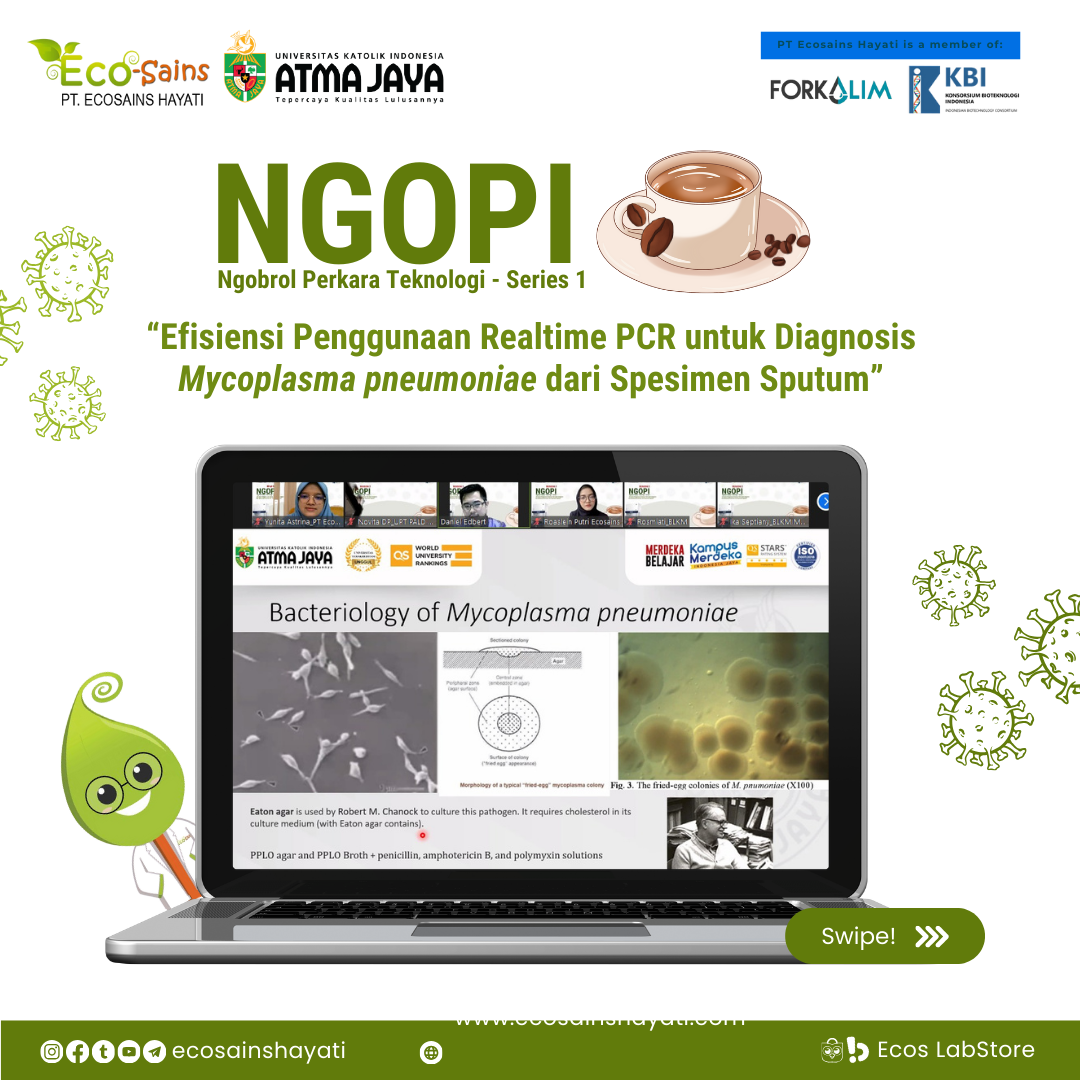Β Β Β Β Β Β NGOPI kali ini merupakan kolaborasi PT Ecosains Hayati bersama Universitas Katolik Indonesia Atma Jaya. Tema yang diangkatkan tentang βEfisiensi Penggunaan Real-Time PCR untuk diagnosis Mycoplasma pneumoniae dari Spesimen Sputumβ. Acara ini menghadirkan pemateri (speaker) dari UNIKA ATMA JAYA, yaitu Bapak dr. Daniel Edbert, M.Ked.Klin Sp.Mk (Dosen Mikrobiologi Fakultas Kedokteran dan Ilmu Kesehatan) dan dimoderatori oleh Ibu Roaslein Putri, M.Si (Application Scientist PT Ecosains Hayati. Selanjutnya juga pemaparan tentang RT-PCR oleh Bapak Aditya Hendrika, S.Si.