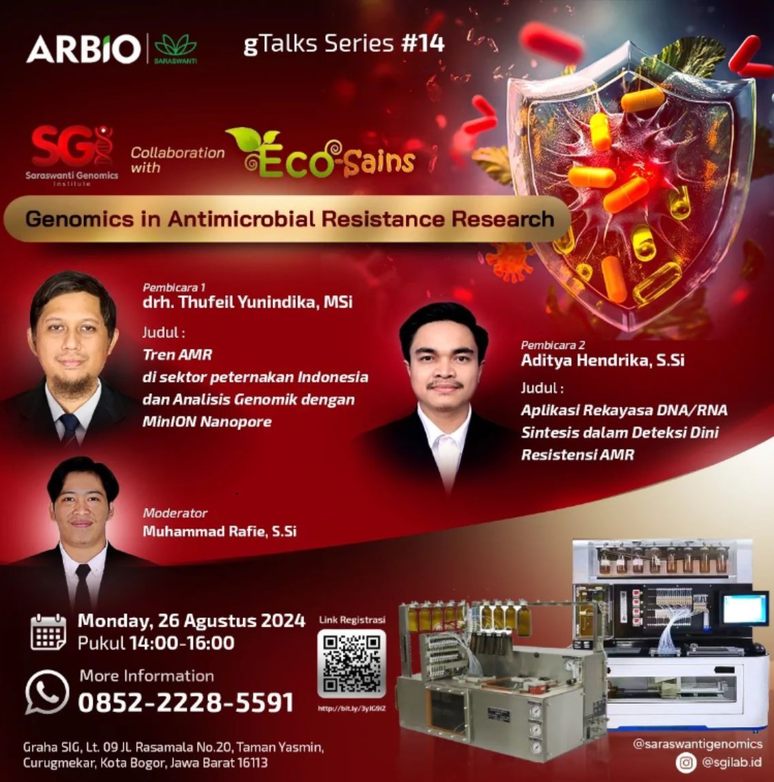 Kali ini Ecosains Hayati berkolaborasi bersama SGI (Saraswanti Genomic Institute) mengangkatkan GTalks Series #14 bertemakan "Genomic in Antimicrobial Resistance", bertujuan untuk memberikan pemahaman tentang apa sih hubungan genom terhadap AMR ?. Acara ini menghadirkan speaker dari BPMSH dan PT Ecosains Hayati. Ecosains Hayati yang merupakan distributor alat lab disini menghadirkan drh. Thufeil Yunindika, MSi yang membahas "Tren AMR di sektor peternakan Indonesia dan Analisis Genomik dengan MinION Nanopore" dan Aditya Hendrika, S.Si mengenai "Aplikasi Rekayasa DNA/RNA Sintesis dalam Deteksi Dini Resistensi AMR".