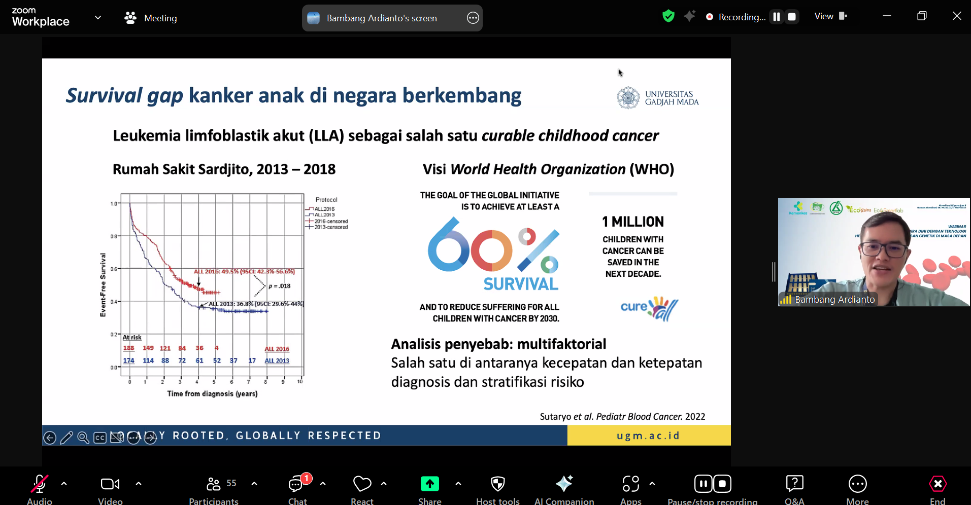 Pada materi kedua, dr. Bambang Ardianto, Ph.D, M.Sc, Sp.A (K)memaparkan strategi penanganan Leukemia anak berbasis genetik. Beliau menyoroti bahwa setiap pasien memiliki profil genetik unik, dan pemahaman terhadap translokasi gen menjadi dasar untuk terapi yang lebih efektif. Pendekatan ini tentunya sesuai dengan tujuan Ecosains Hayati dalam memperkenalkan Hemavision sebagai alat diagnostik yang mampu menjembatani penelitian genetik dan kebutuhan klinis.